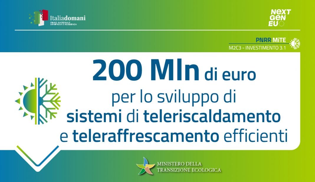 Duecento milioni di euro per finanziare progetti volti alla realizzazione di nuovi sistemi di teleriscaldamento e teleraffrescamento efficiente; all’estensione a nuovi utenti di reti esistenti e al loro efficientamento. A dare attuazione all’investimento 3.1 (M2C3) del PNRR il decreto firmato dal ministro della Transizione Ecologica, Roberto Cingolani.