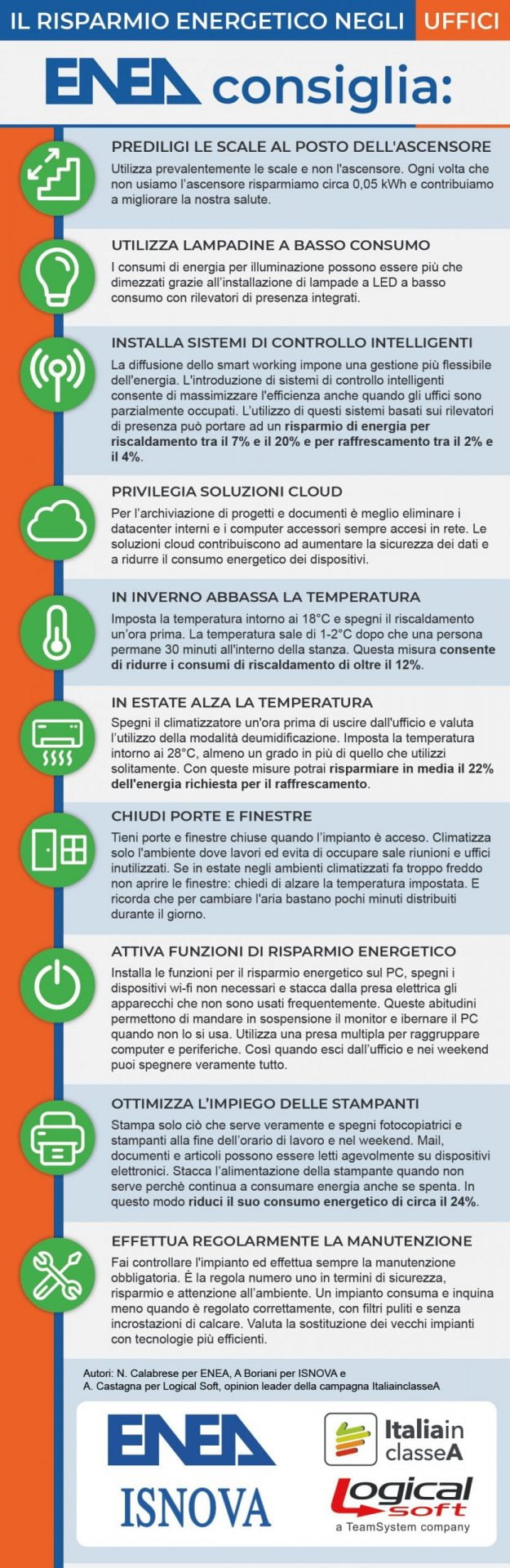 Attuare dei comportamenti consapevole negli uffici pubblici e privati per un uso consapevole dell’energia, rispettando l’ambiente ed eliminando gli sprechi. Enea insieme a Logical Soft e ISNOVA hanno pubblicato serie di indicazioni puntuali e delle regole di comportamento.
