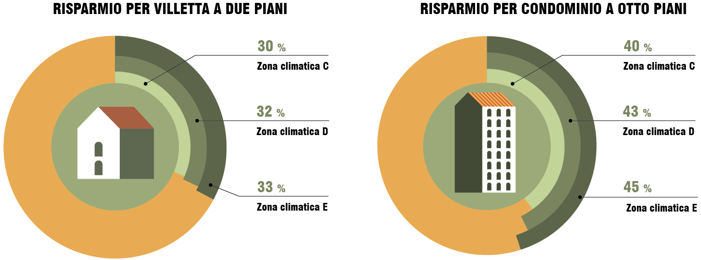 Il cappotto termico può far risparniare dal 30 al 33% di energia a una villetta a due piani, e dal 40 al 45% a un condominio di otto piani.